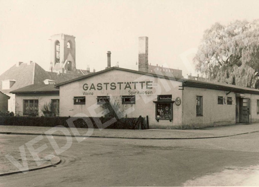 Abb. 13 Foto oben : Die Gaststätte von Ohlmeier am Immanuelplatz, im Hintergrund ist der zerstörte Kirchturm der Immanuel Kirche zu sehen. Das Pastorat wurde schon wieder aufgebaut. Die Aufahme wurde zwischen 1951 und 1952 gemacht. Aufnahme unten von 2010 |